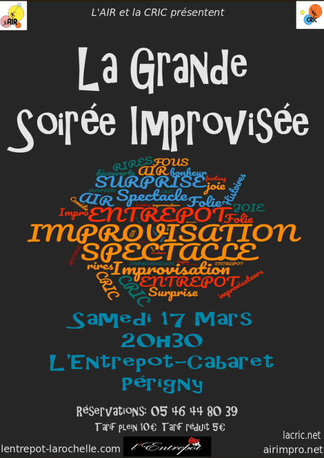 Le 17 mars 2018, l’AIR et la CRIC ont co-organisé, un spectacle à l’Entrepôt de Périgny en sortie de stage. Sous la direction de Baptiste Lafon, formateur à Décalez – structure de formation à Bordeaux – 11 improvisateurs ont créé des histoires improvisées à partir des métiers et des rêves les plus fous du public. Après la découverte d’une montre à téléportation, nous avons mangé du chien sur la planète Mars, puis dégusté des fromages de chèvre néerlandais, et découvert les dons d’invisibilité de Niel !!! Chaque improvisation proposée était en format plutôt long, de 15 à 20 minutes.